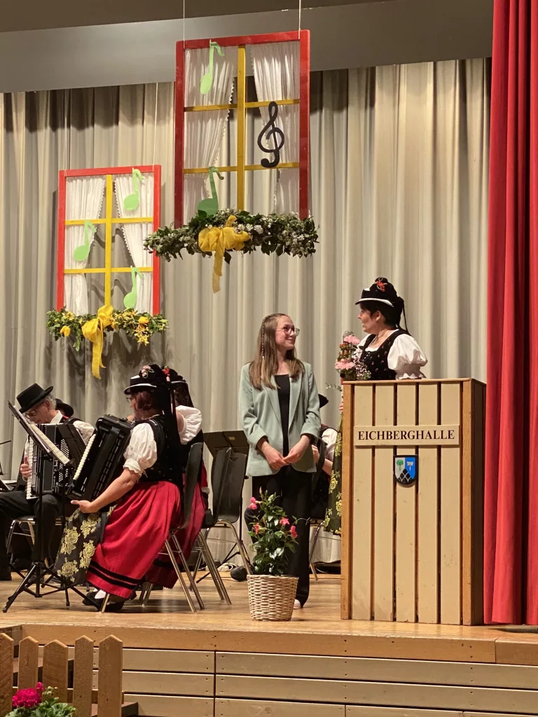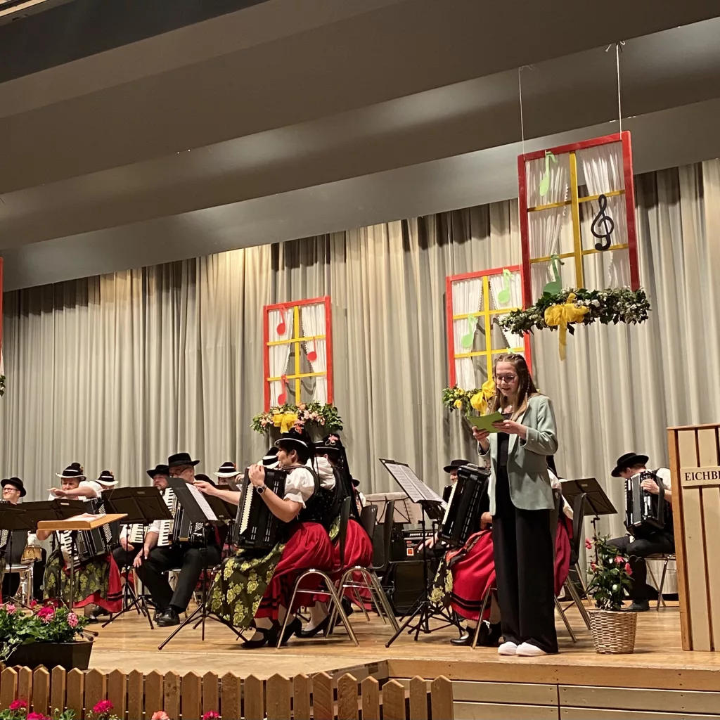 Ronja Reichenbach von der Jugendtanzgruppe der Akkordeon-Trachtengruppe führte charmant durch das Programm des Jugendorchester und des Erwachsenenorchesters. So konnte sie dem Publikum zu jedem Stück einige Informationen zur Herkunft oder Bedeutung mitgeben.